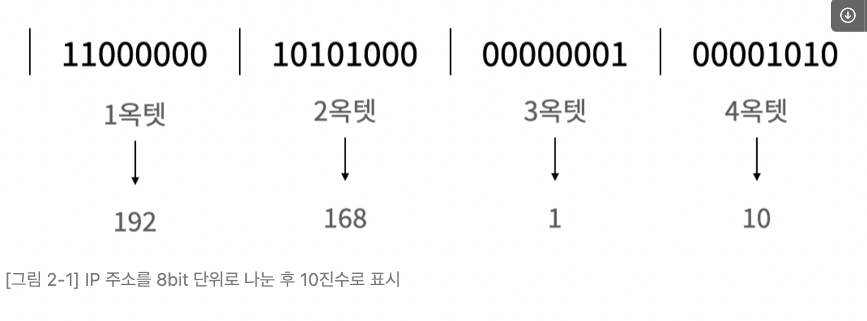 IP주소를 컴퓨터가 이해할 수 있으려면 2진수로 작성되어 있어야 하지만, 사람이 읽기 쉬워야 하므로 8bit 단위로 나눠서 10진수로 표시합니다.