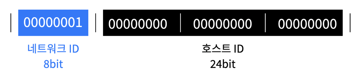 • 처음 8bit가 네트워크 ID, 나머지 24bit가 호스트 ID 입니다.