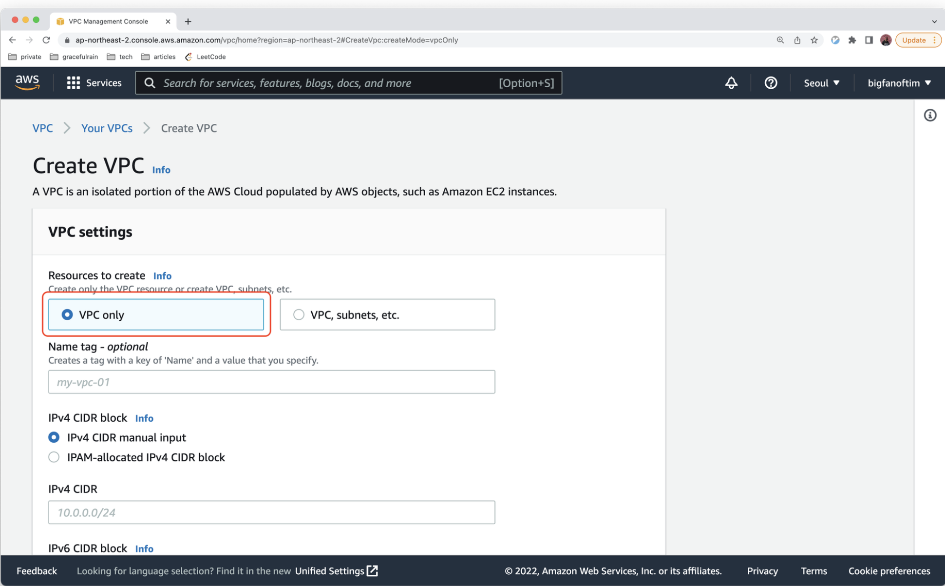 2. 위에서 언급한대로 다양한 옵션들을 자동으로 생성해주는 것이 아니라 필요에 따라 생성, 제거 하는 방법을 배우기 위해 오직 VPC만 생성하도록 하겠습니다.