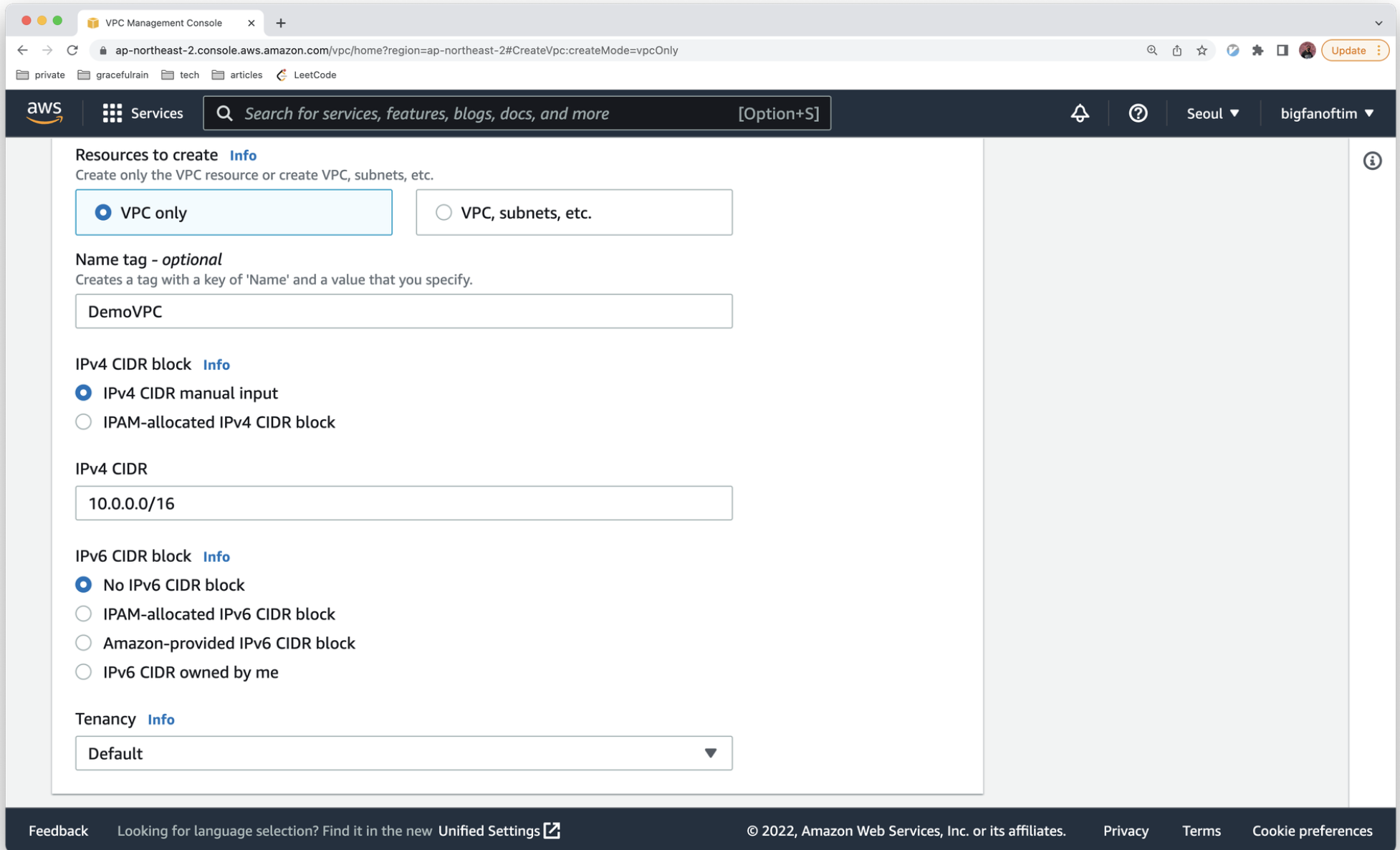 3. 다음과 같이 설정하여 VPC를 생성합니다.