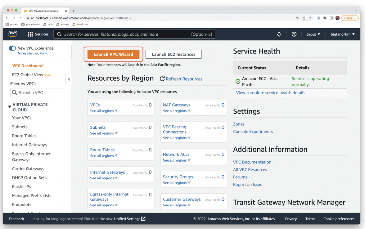 - VPC 페이지로 이동하여 Launch VPC Wizard 를 클릭하여 VPC 생성을 시작합니다.[그림 2-2] VPC Wizard 시작