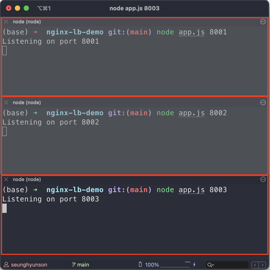[그림 3-1] 처럼 첫번째 서버가 정상적으로 실행되었다면, 터미널 창 두개를 추가로 열어 서버 2개를 각각 port 8002와 8003을 할당하여 실행해줍니다.