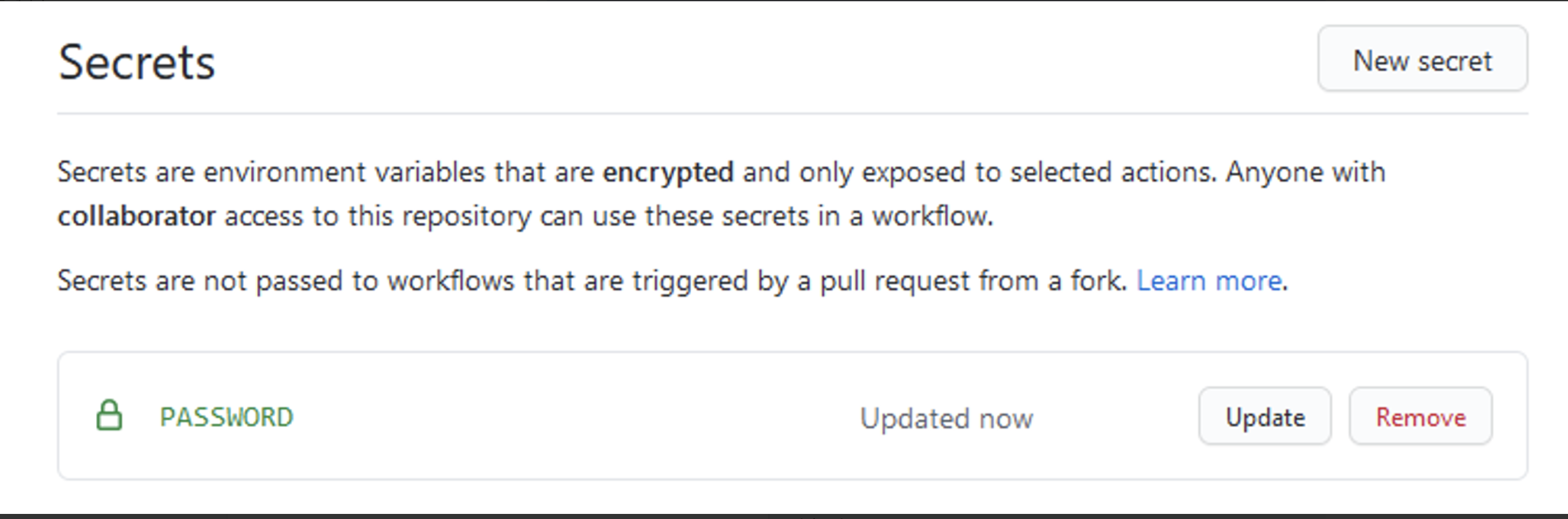 - Dockerhub에 push하기 위해서는 먼저 dockerhub에 로그인이 필요합니다. 그리고 로그인을 하기 위해서는 dockerhub의 아이디와 비밀번호가 필요 하겠죠? 위 부분의 secrets.DOCKERHUB_USERNAME 과 secrets.DOCKERHUB_TOKEN 는 Github의 Secrets 설정 페이지에 미리 추가해놓아야 사용할 수 있습니다.