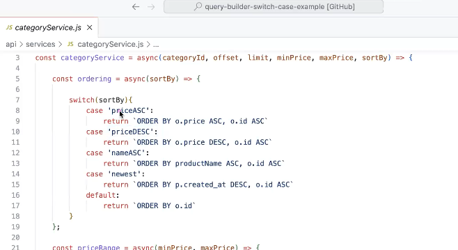 ORDER BY o.price ASC, o.id AS ${orderingQuery}
