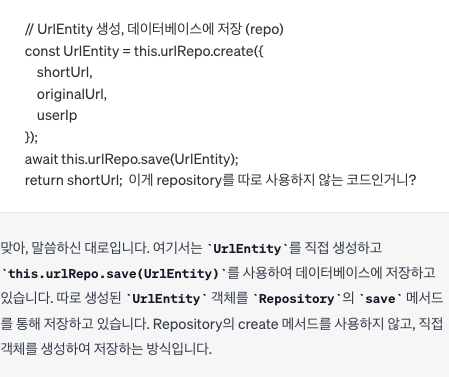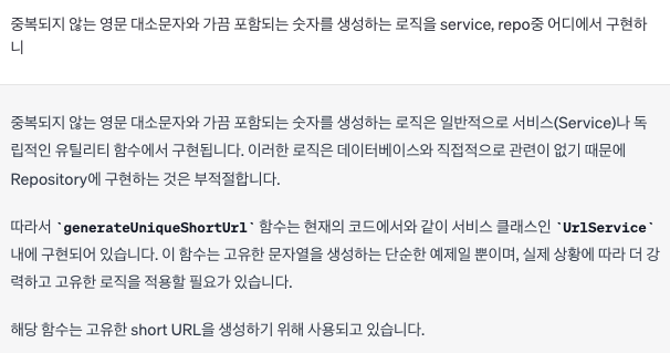 --> 중복되지 않는 영문 대소문자와 가끔 포함되는 숫자를 생성하는 로직은 일반적으로 서비스(Service)나 독립적인 유틸리티 함수에서 구현. 이러한 로직은 데이터베이스와 직접적으로 관련이 없기 때문에 Repository에 구현하는 것은 부적절