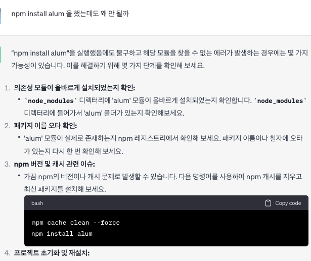 아래의 경우,npm install alum 모듈 설치 여부 확인: 프로젝트에 필요한 패키지 또는 모듈이 설치되어 있는지 확인. 필요한 모듈이 설치되어 있지 않다면 해당 모듈을 설치