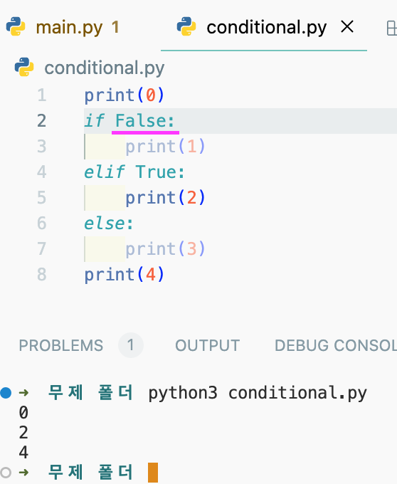 elif로 넘어가서 2 실행되고