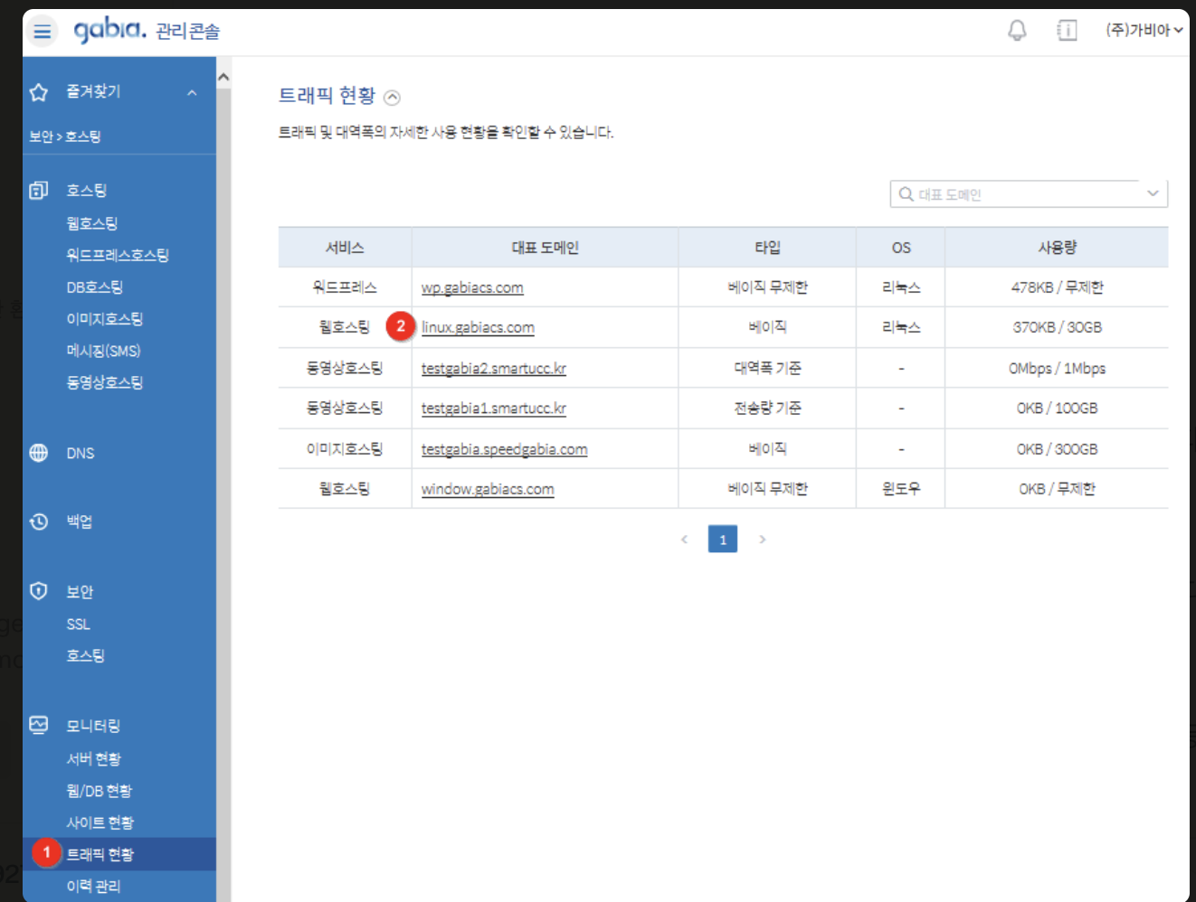 가비아 호스팅을 이용하는 경우, 제어판에서 트래픽 현황을 확인할 수 있습니다.