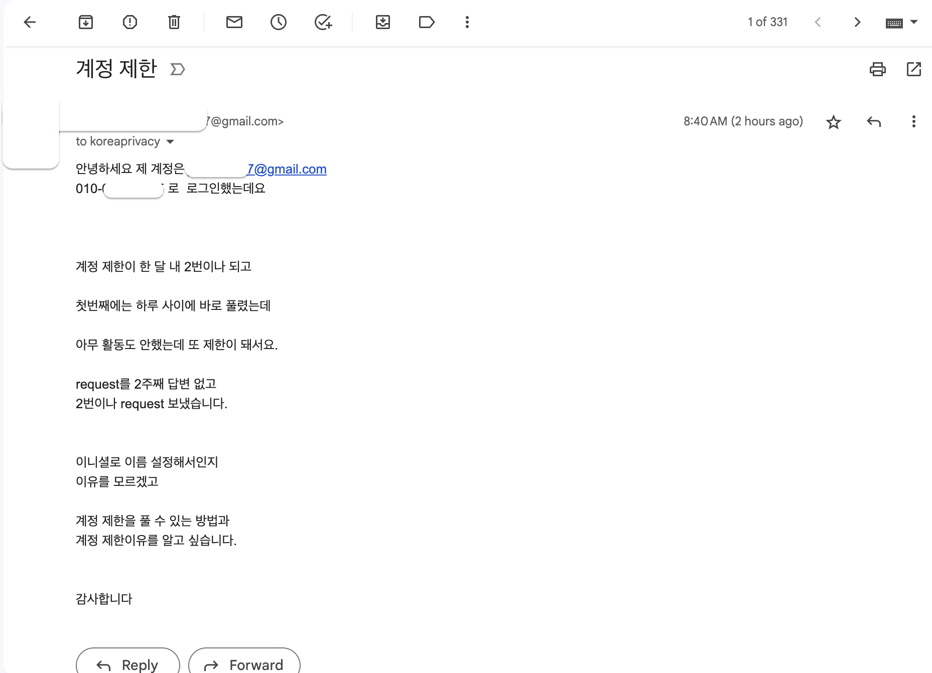 내 개인정보와 문의 내용(계정 제한 해제 요청 답변 + 계정 제한 이유 안내 요청)을 말했고