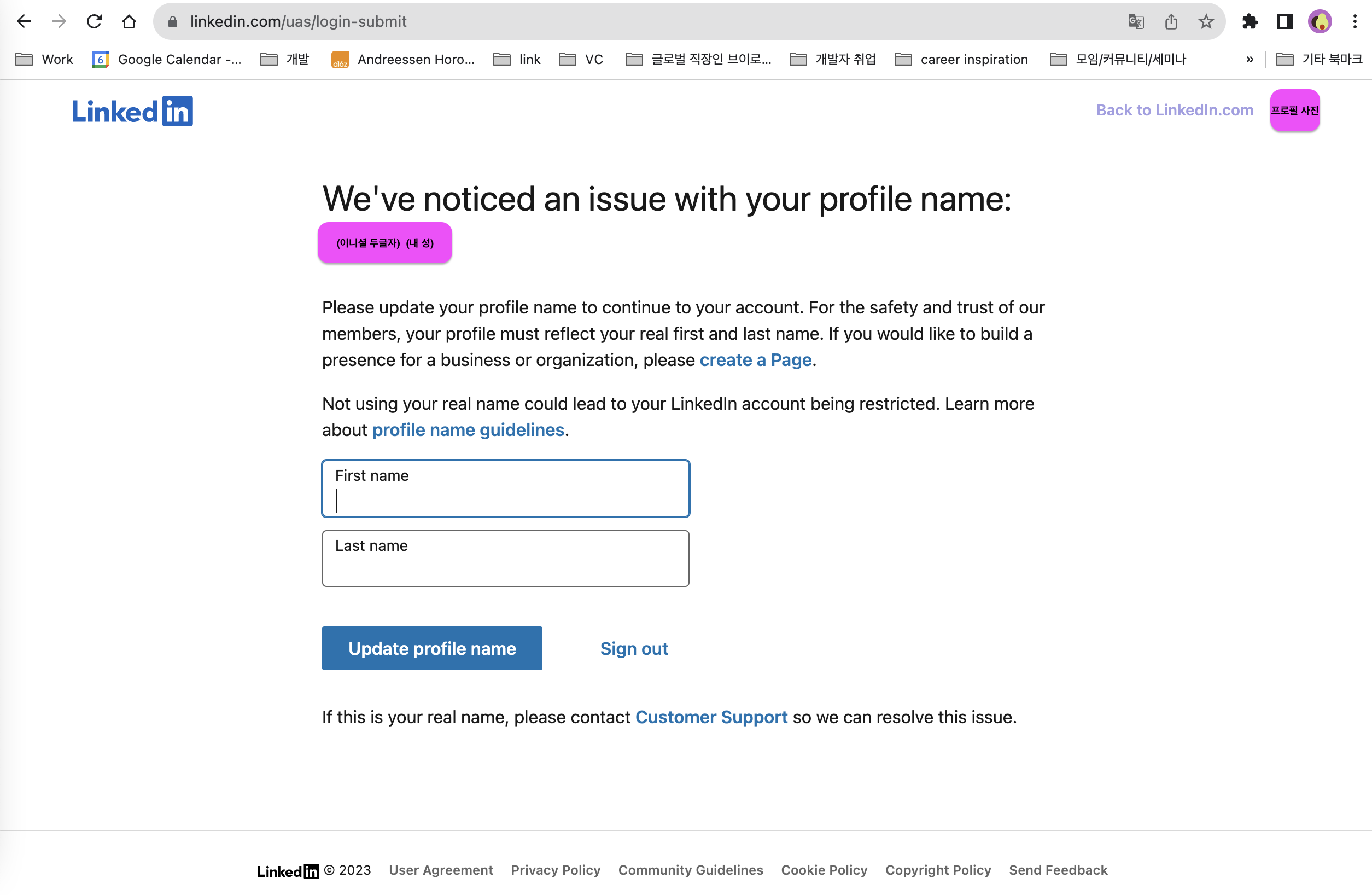 update profile name 버튼 클릭하니.. 바로 linkedin 페이지 접속!