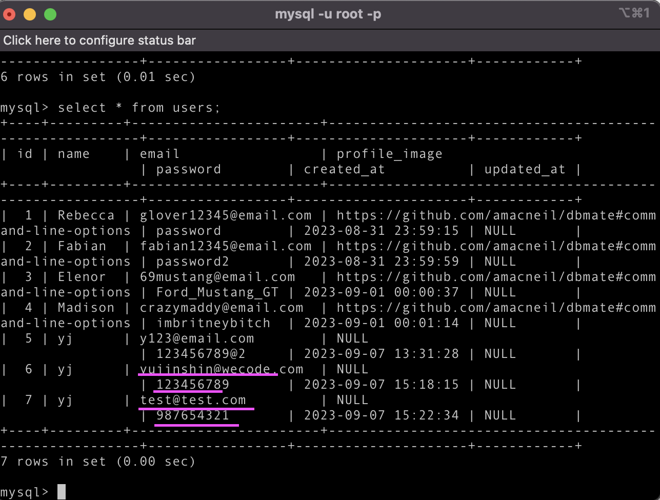 'mysql> select * from users;' 쳐서