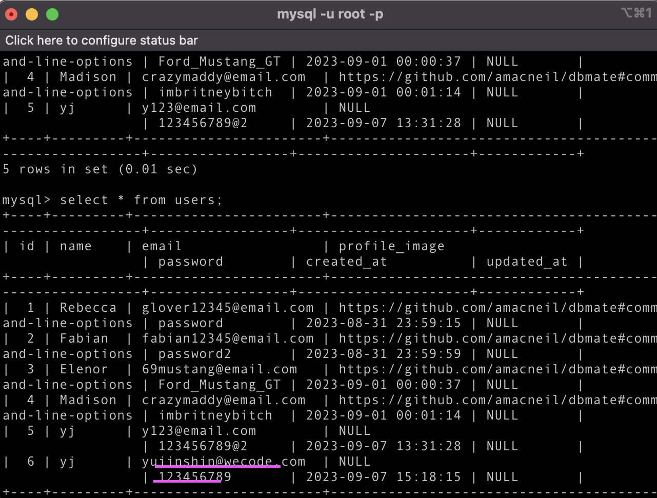 'mysql> select * from users;' 쳐서