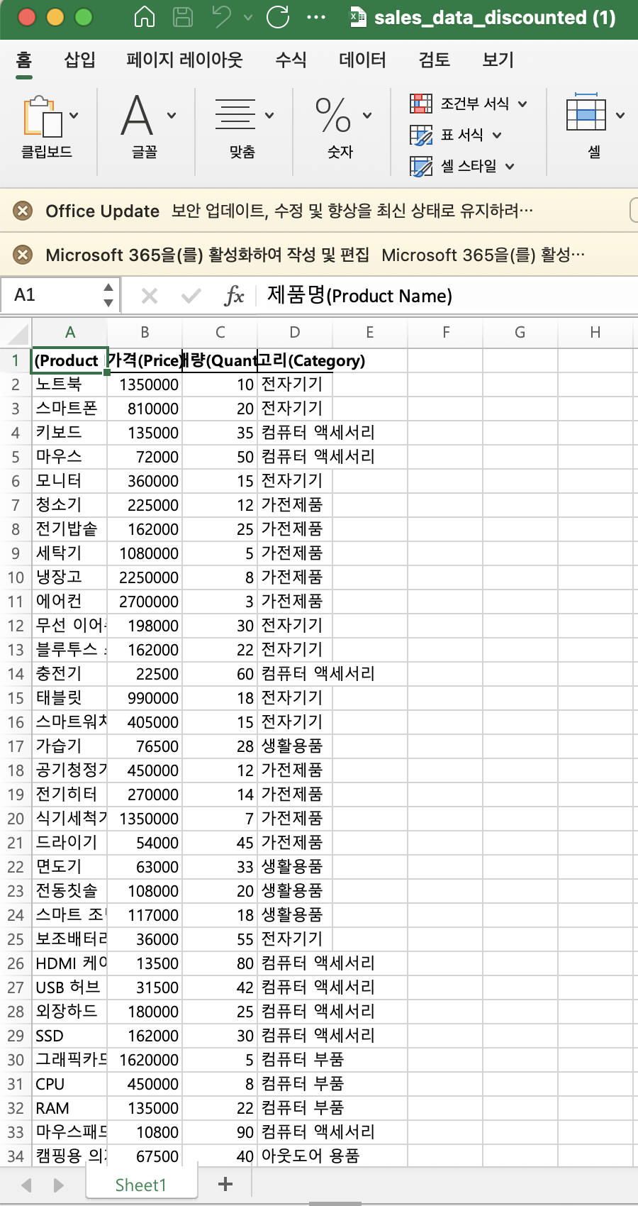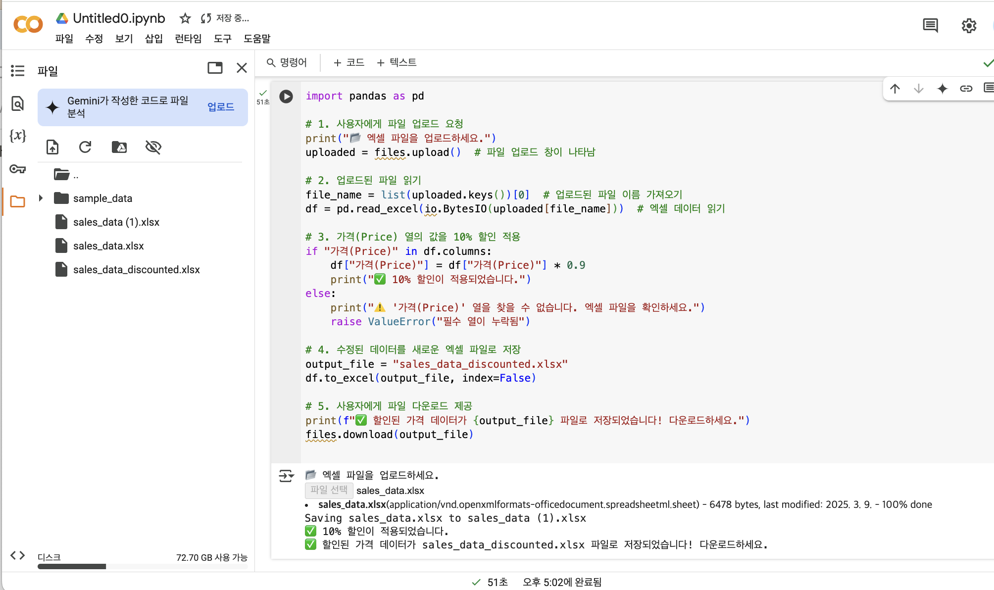 스터디장이 미리 적어온 코드를 Colab 에 복사 해서 실행 시켜보기import pandas as pd# 1. 엑셀 파일 불러오기file_path = "sales_data.xlsx"df = pd.read_excel(file_path)# 2. 가격(Price) 열의 값을 10% 할인 적용df["가격
