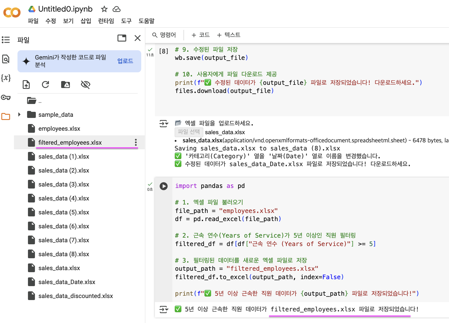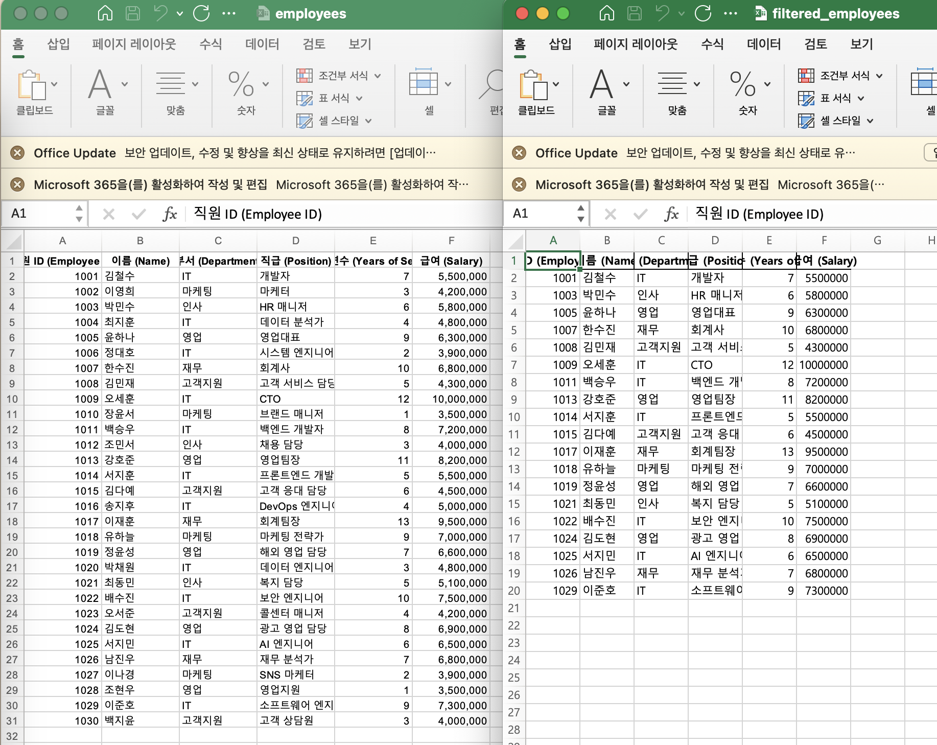- 필터링된 데이터를 새로운 엑셀 파일(filtered_employees.xlsx)로 저장