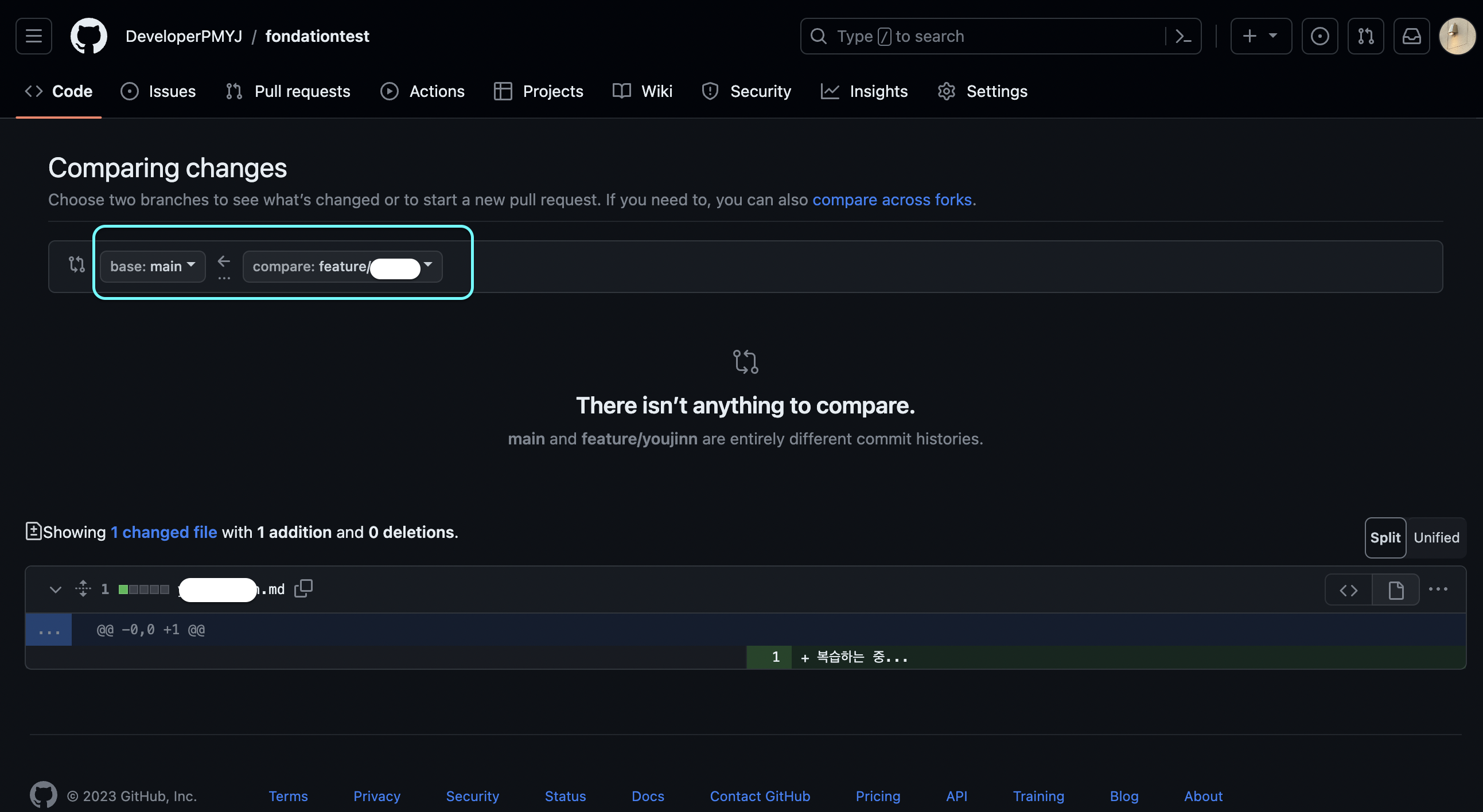 base:는 항상 main 이다. --> 코드가 Merge 병합돼서 합쳐질 장소