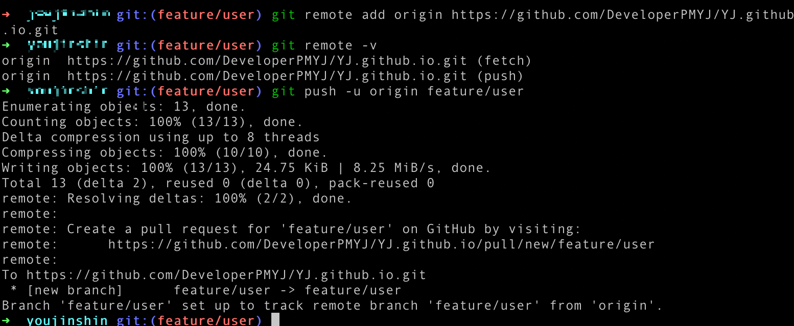 - 이후 git remote -v를 해보고, 찍힌 origin (repository 주소)가 내가 올릴 repository가 맞는지,, (난 자동완성된 이전 repository에 올라가 있었다 ㅎ)