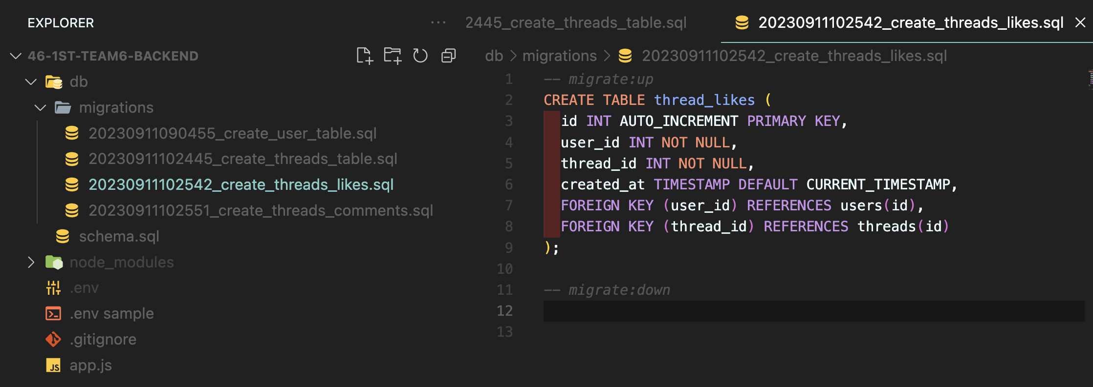 dbmate로 테이블들을 하나의 파일안에 만들어서 한번에 합치는 것.
