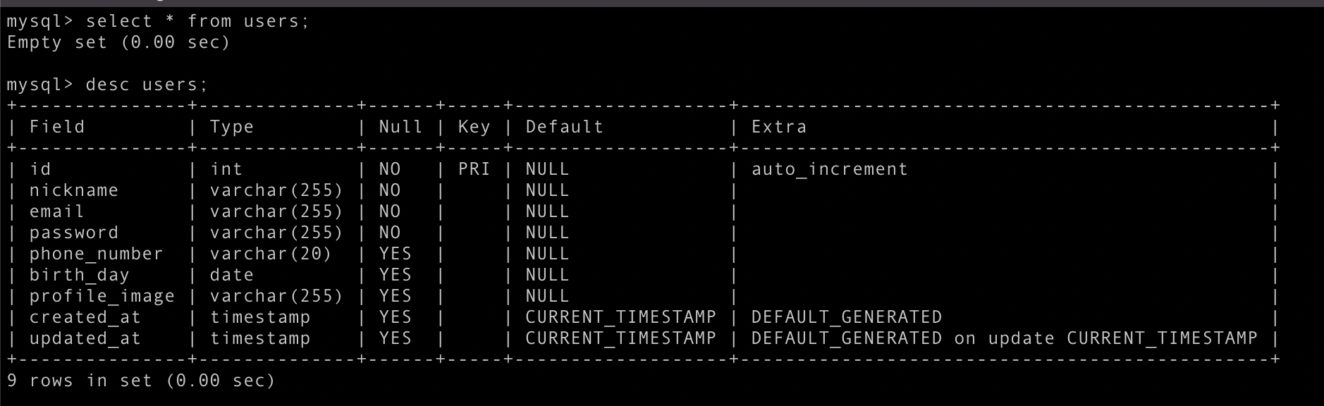 아아아 하면서 desc users;로 했다.
