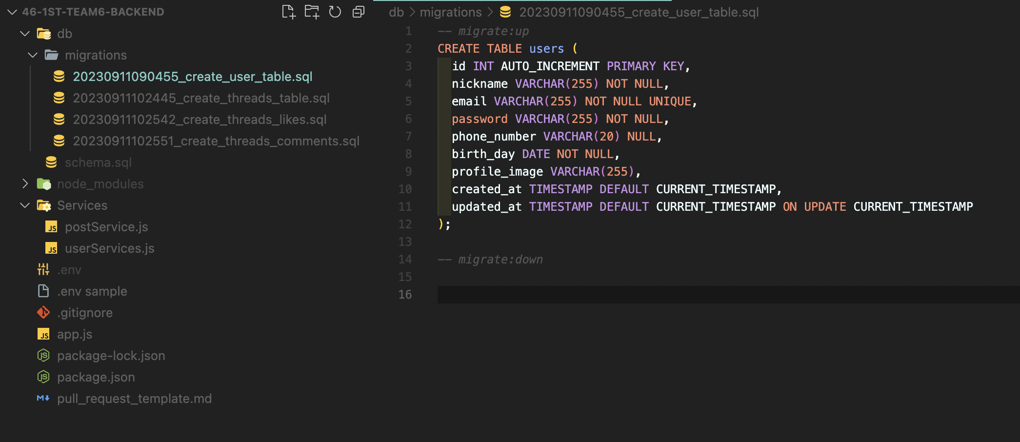 dbmate new [테이블이름] --> 테이블 이름은 알아보기 쉽게 지을 것.