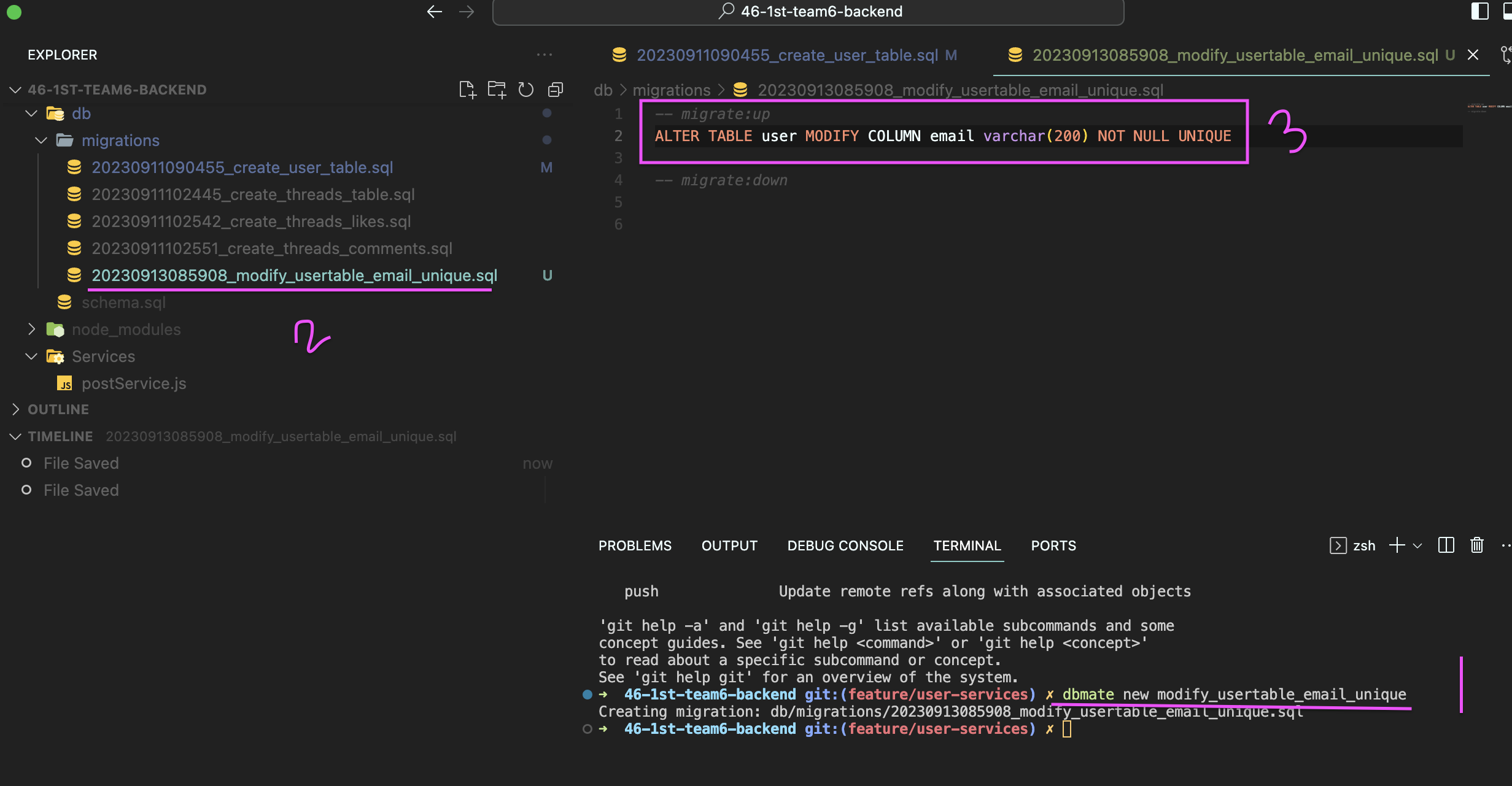 2) 위와 같이 수정을 해야 하는데, migration 파일 내부 migrate:up 아래 부분에 수정 후, 터미널에 dbmate up 하면 되는지 알았는데,