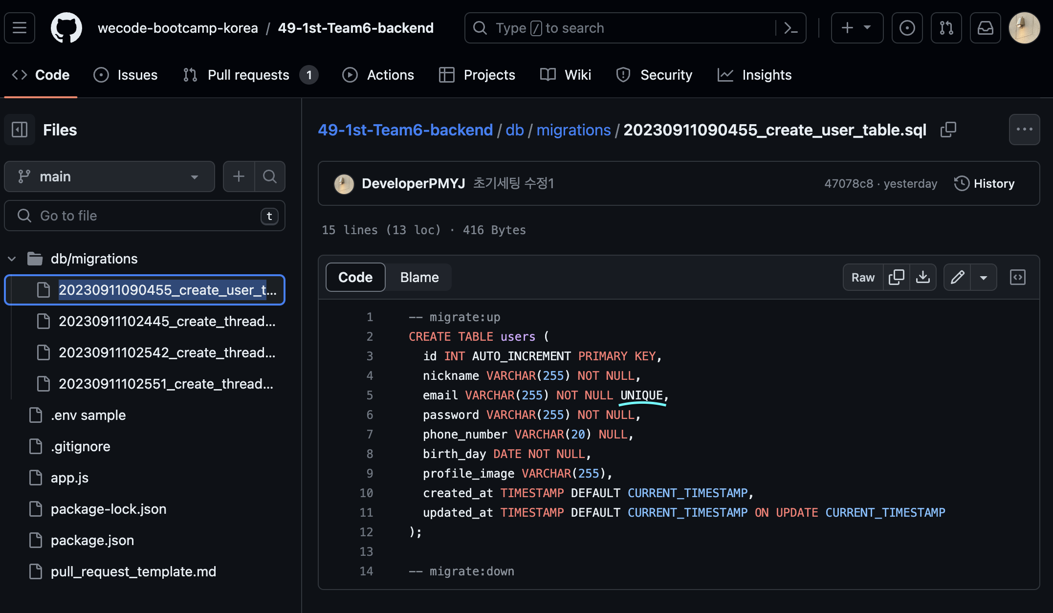 dbmate new [테이블이름] --> 테이블 이름은 알아보기 쉽게 지을 것.