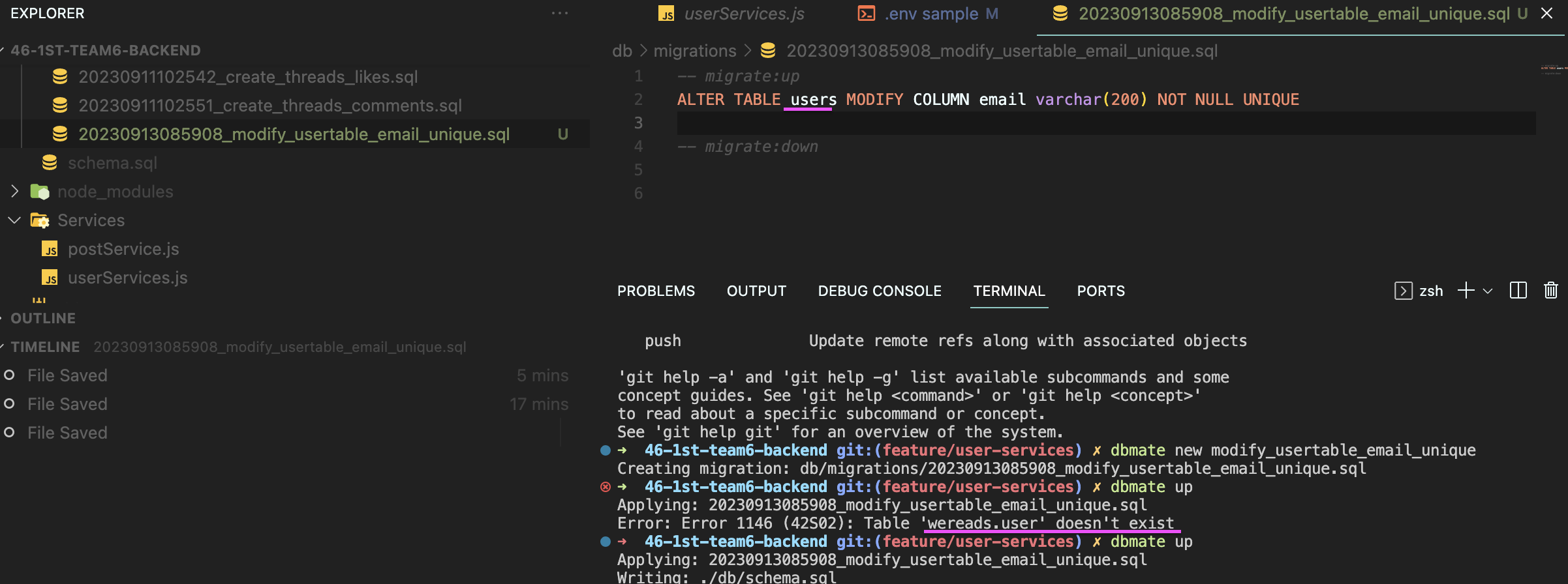 2) 위와 같이 수정을 해야 하는데, migration 파일 내부 migrate:up 아래 부분에 수정 후, 터미널에 dbmate up 하면 되는지 알았는데,