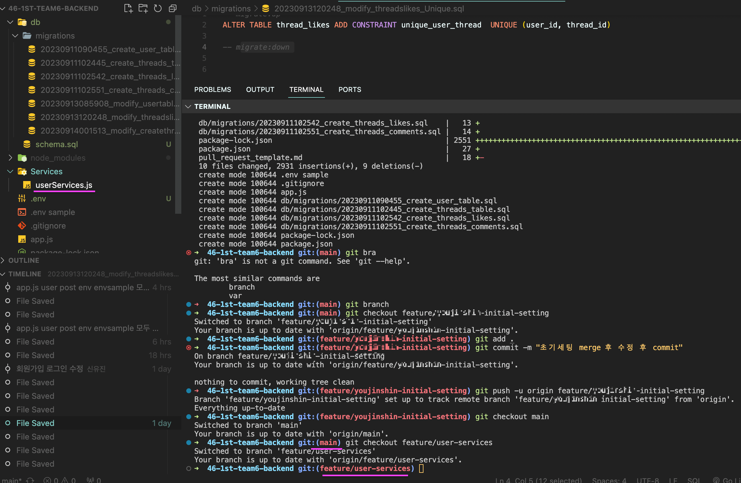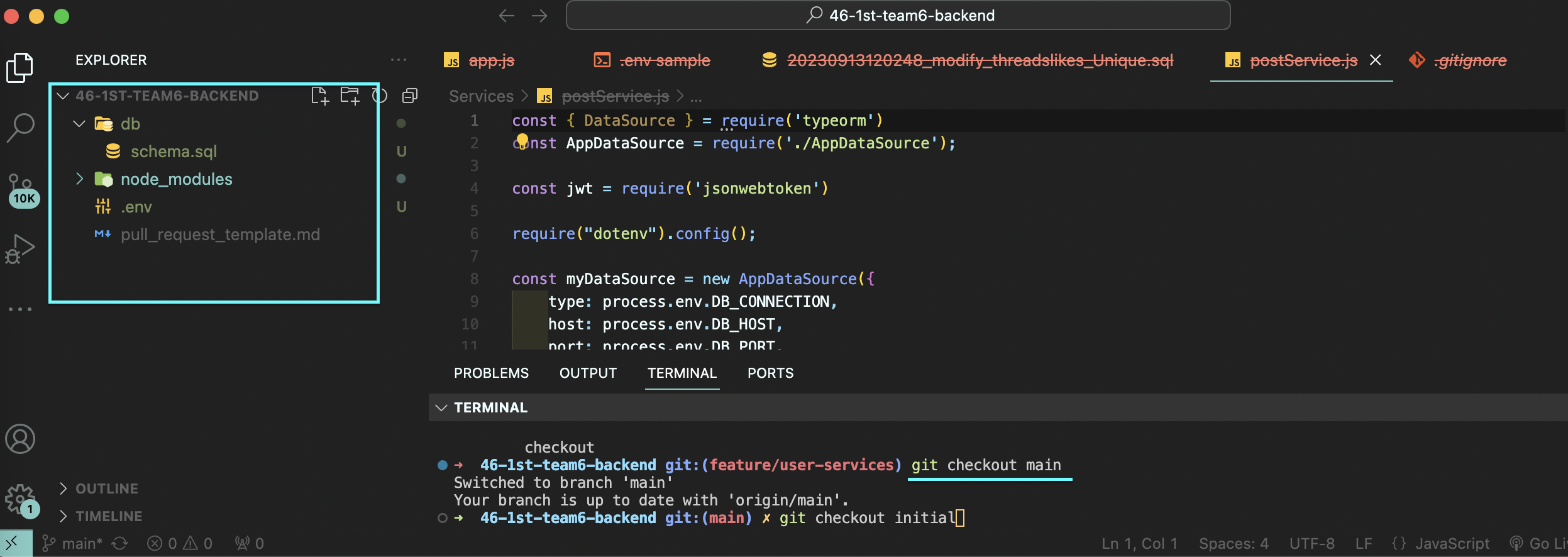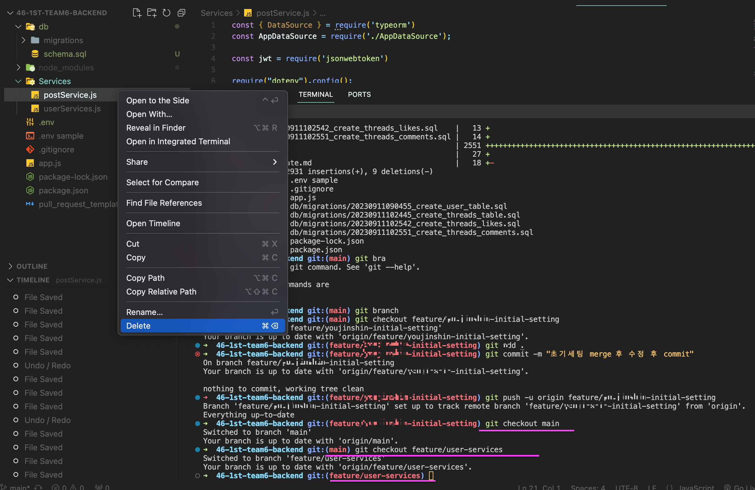 그러기에 초기화세팅 branch 안에서 user service branch를 파야지, 초기화세팅 branch에 들어간