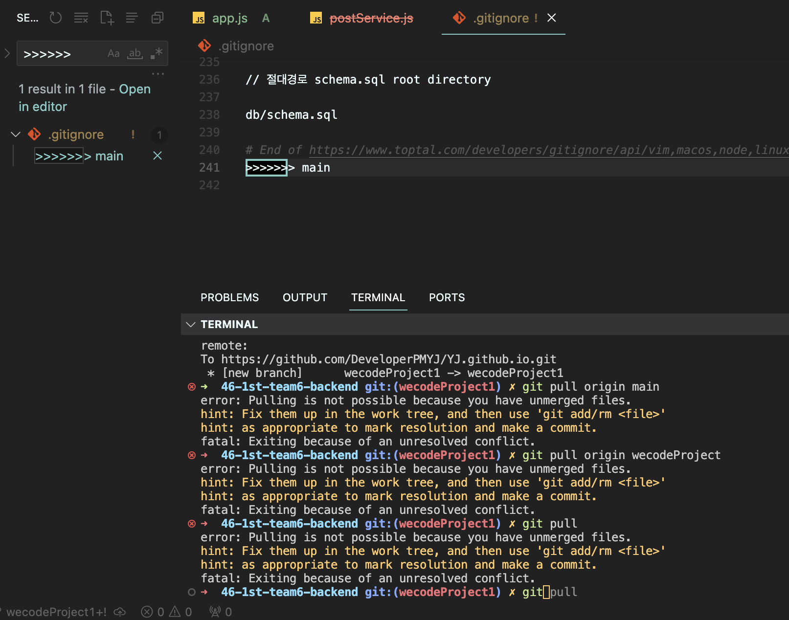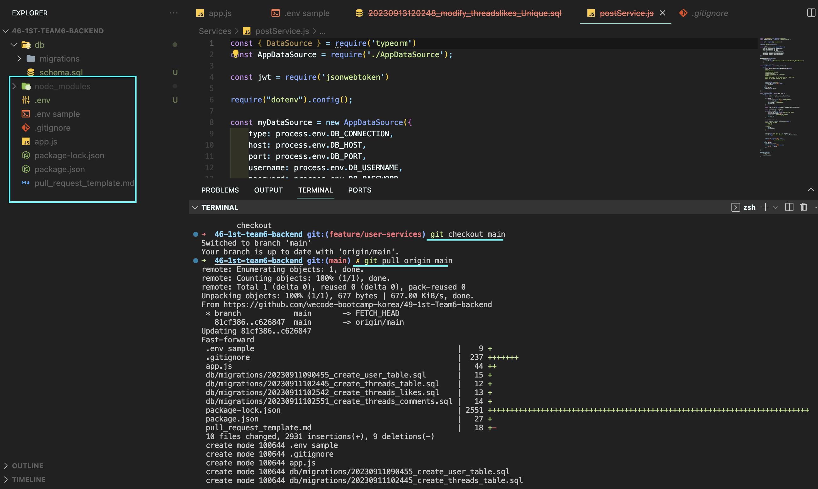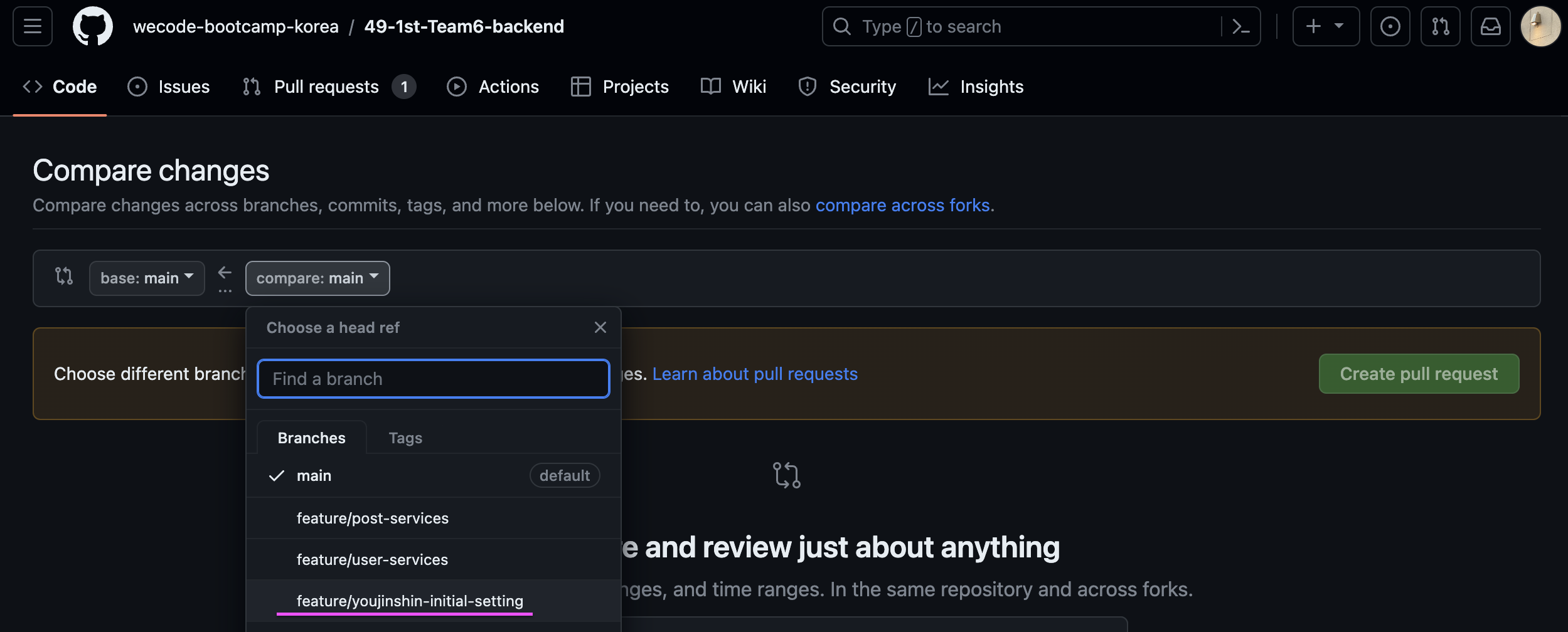 그러기에 초기화세팅 branch 안에서 user service branch를 파야지, 초기화세팅 branch에 들어간