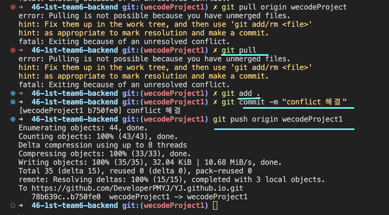 해결한 것을 다시 remote에 올려야 한다. 그러면 remote에는 충돌 안 나겠지 ~