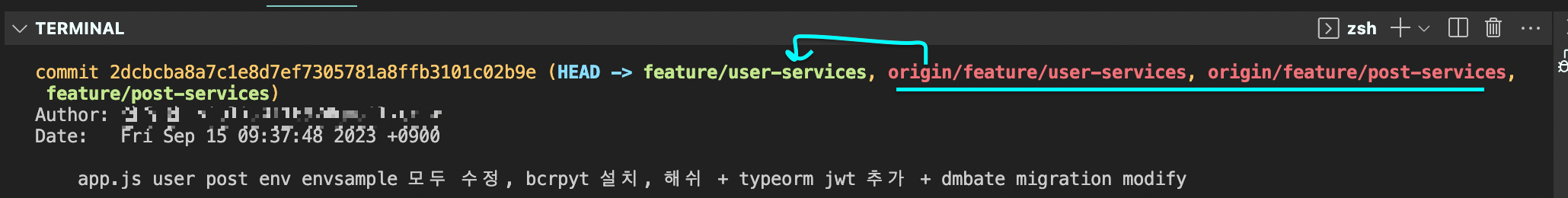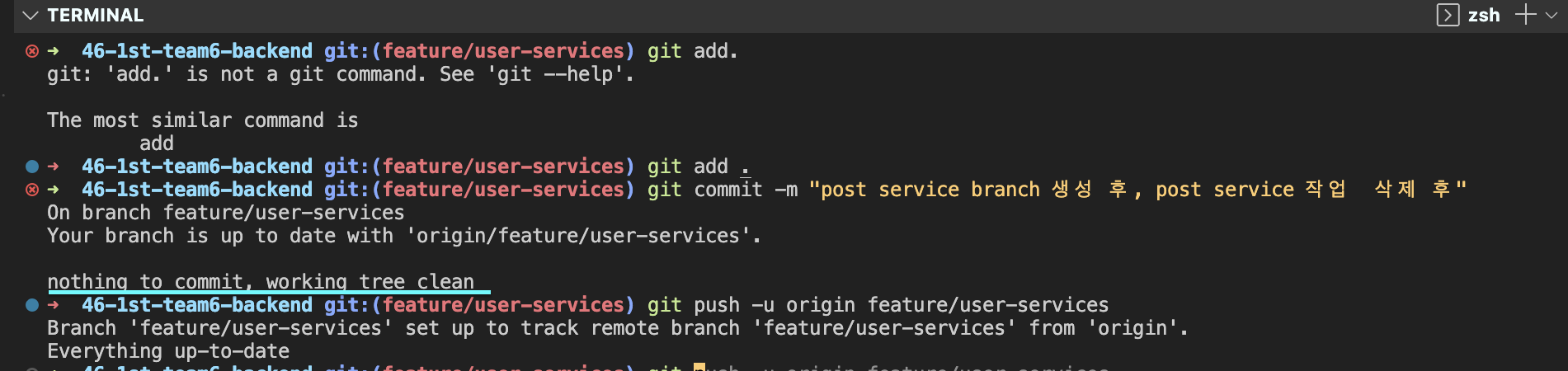 [2] 내가 user service branch 안에 있는 상태에서, post service 작업을 했음.