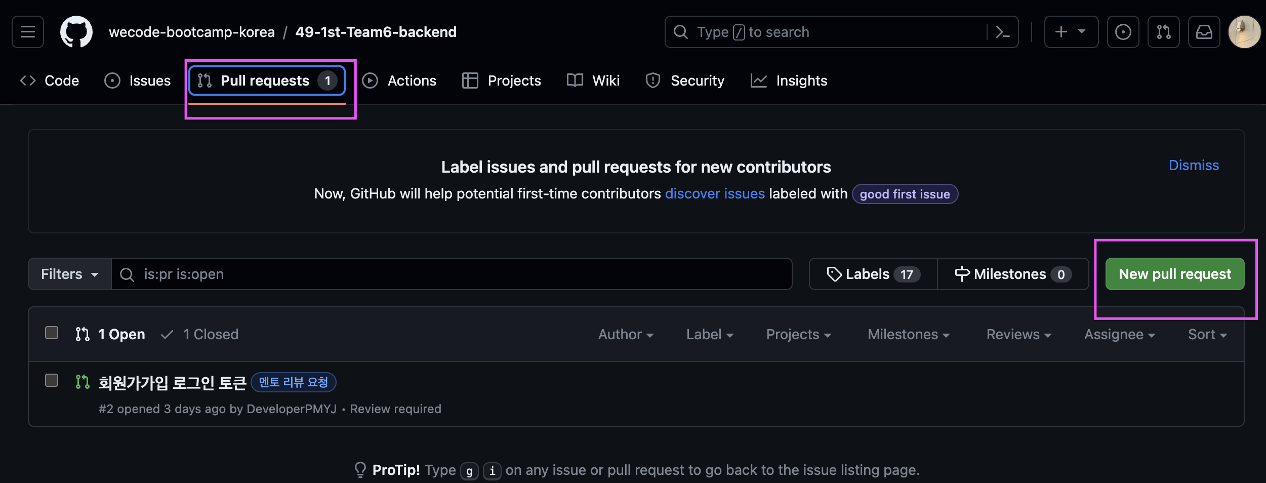대신 우리가 원래 pr 할 때처럼 초록 안내창이 안 뜨겠지만,