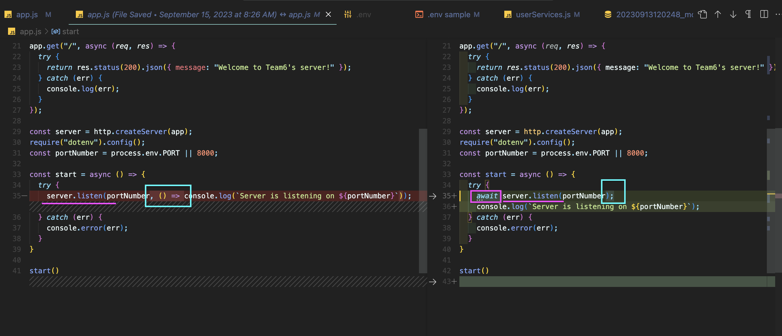 --> await server.listen()를 사용하여 서버가 시작될 때까지 기다리도록 수정