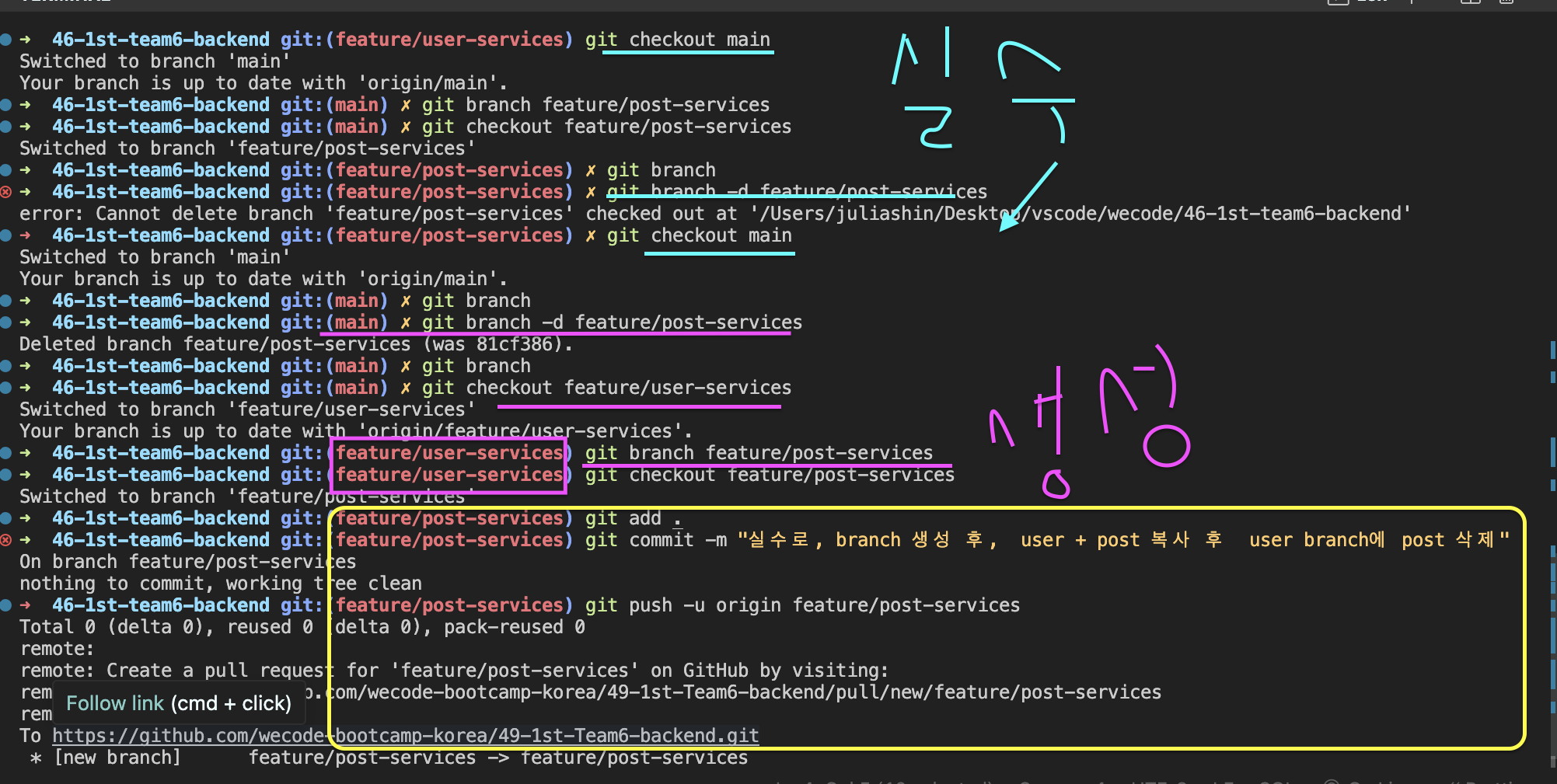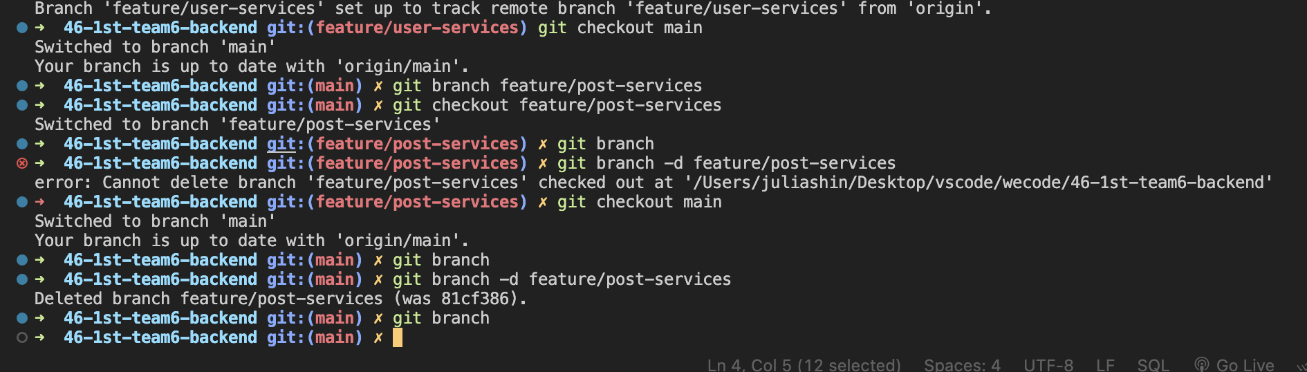 2. user service branch checkout 해서 post 삭제 후 나오기