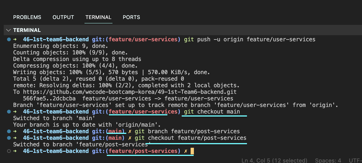 그리고 main에서 post service branch 생성 후