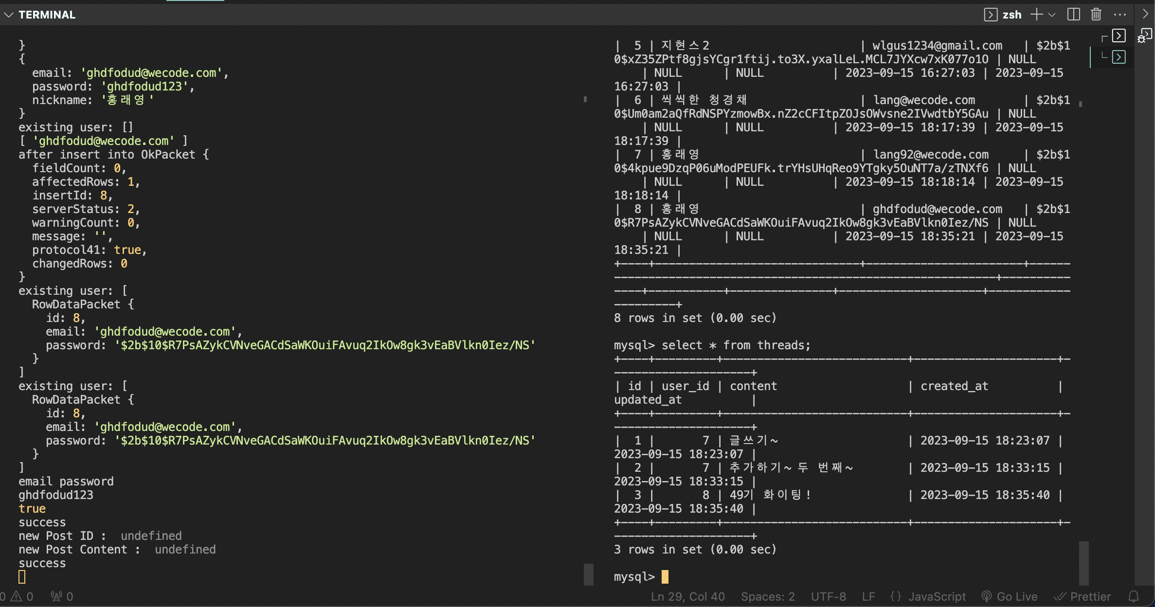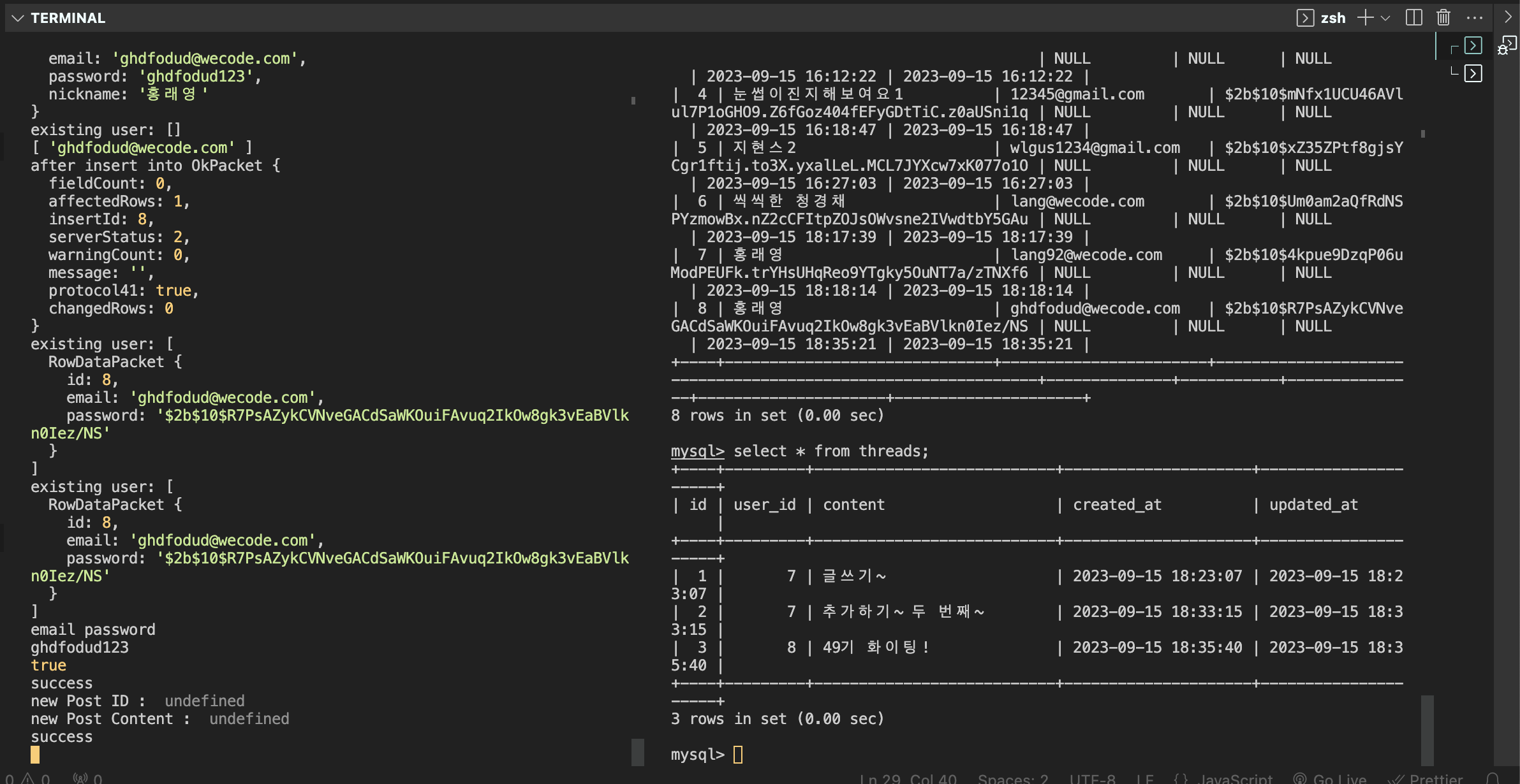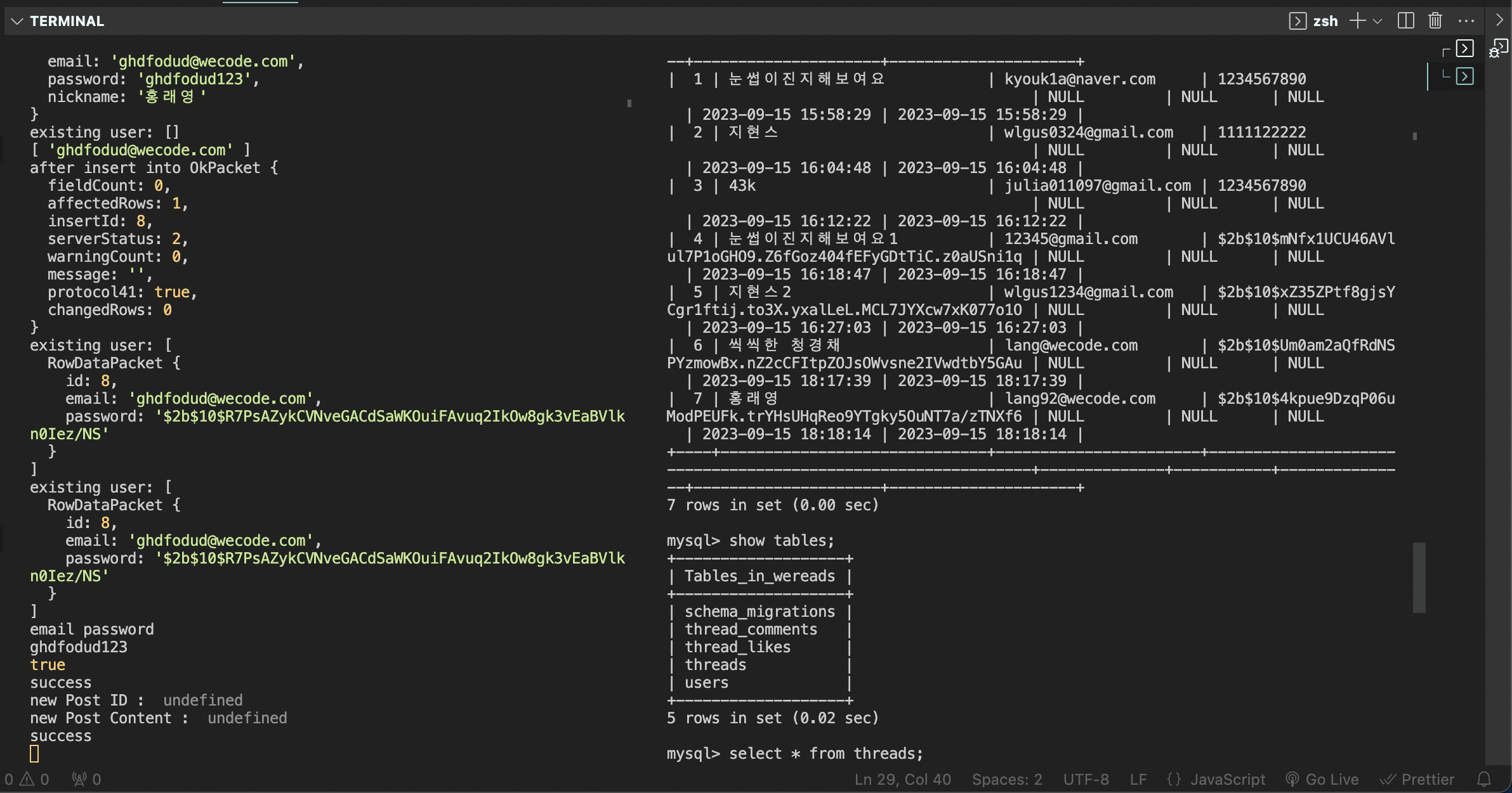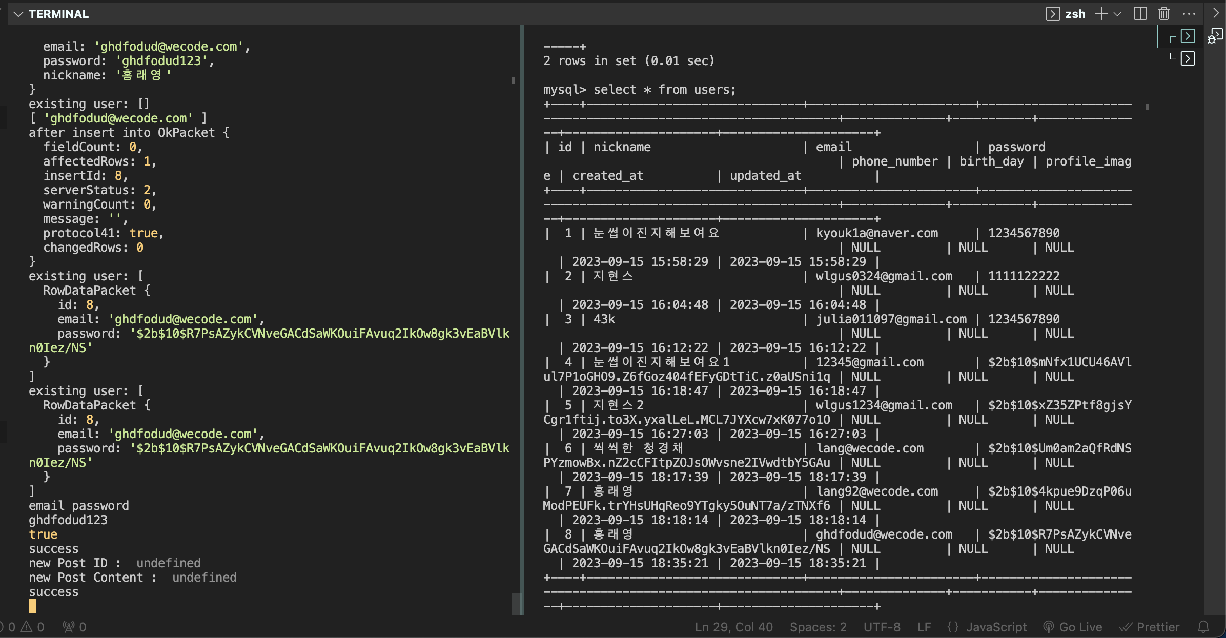 회원가입 확인 하는 법 -> show tables, select * from users;