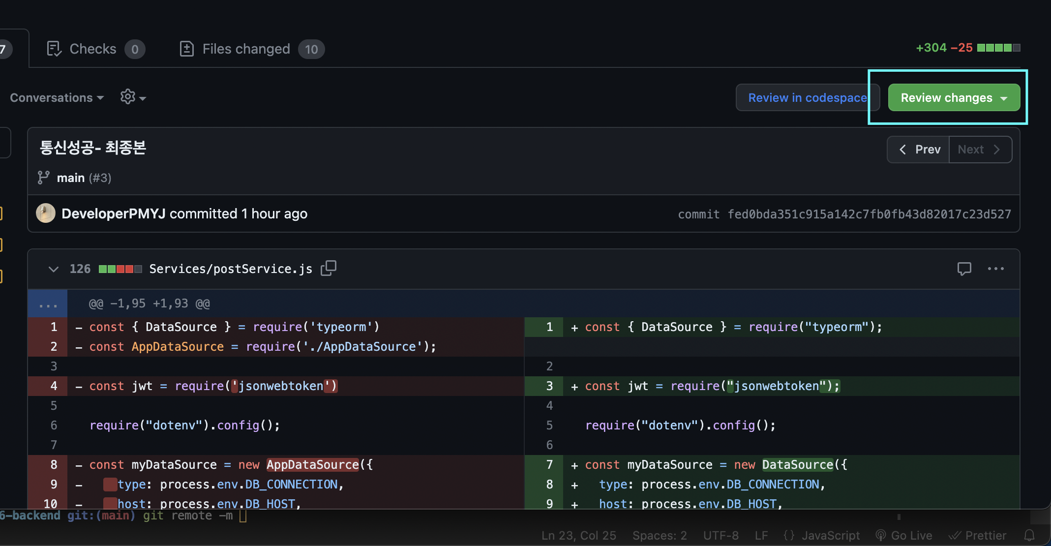 프로젝트 끝나고 일단 통신 과정에 대한 정리를 했다. 정리한 내용은, - 통신 전 수정한 코드 - 통신 과정 기록 - 통신 후 깃허브에 push, pull request review, merge 기록 그리고, 나의 개인 깃허브 repositor