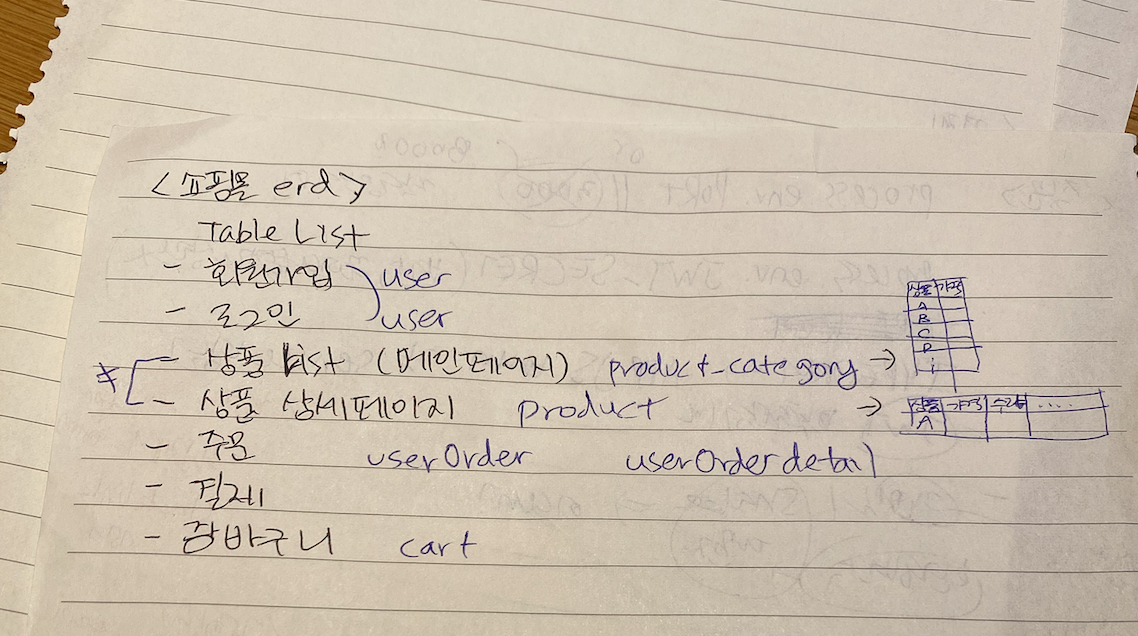 각자 1시간씩 생각해보고 그려보고 테이블과 관계성을 고려하기로 했다. 나는 일단 erd 관계, modelling 툴을 사용하지 않고, 먼저 손으로 그리면서 하기로 했다. 쇼핑몰 erd 검색해서 나오는 table name, column https://velog.io/@1afterwon/%EC%87%BC%ED%95%91%EB%AA%B0-%EB%A7%8C%EB%93%A4%EA%B8%B0-%EC%87%BC%ED%95%91%EB%AA%B0-ERD-%EC%84%A4%EA%B3%84 Table list 어떤 테이블들이 필요할 지 table name부터 정해보았다 이때 내가 잘못했던 점 - 회원가입과 로그인은 'user' table - 메인페이지와 상세페이지는 'product' 'product detail'로 하나의 ..