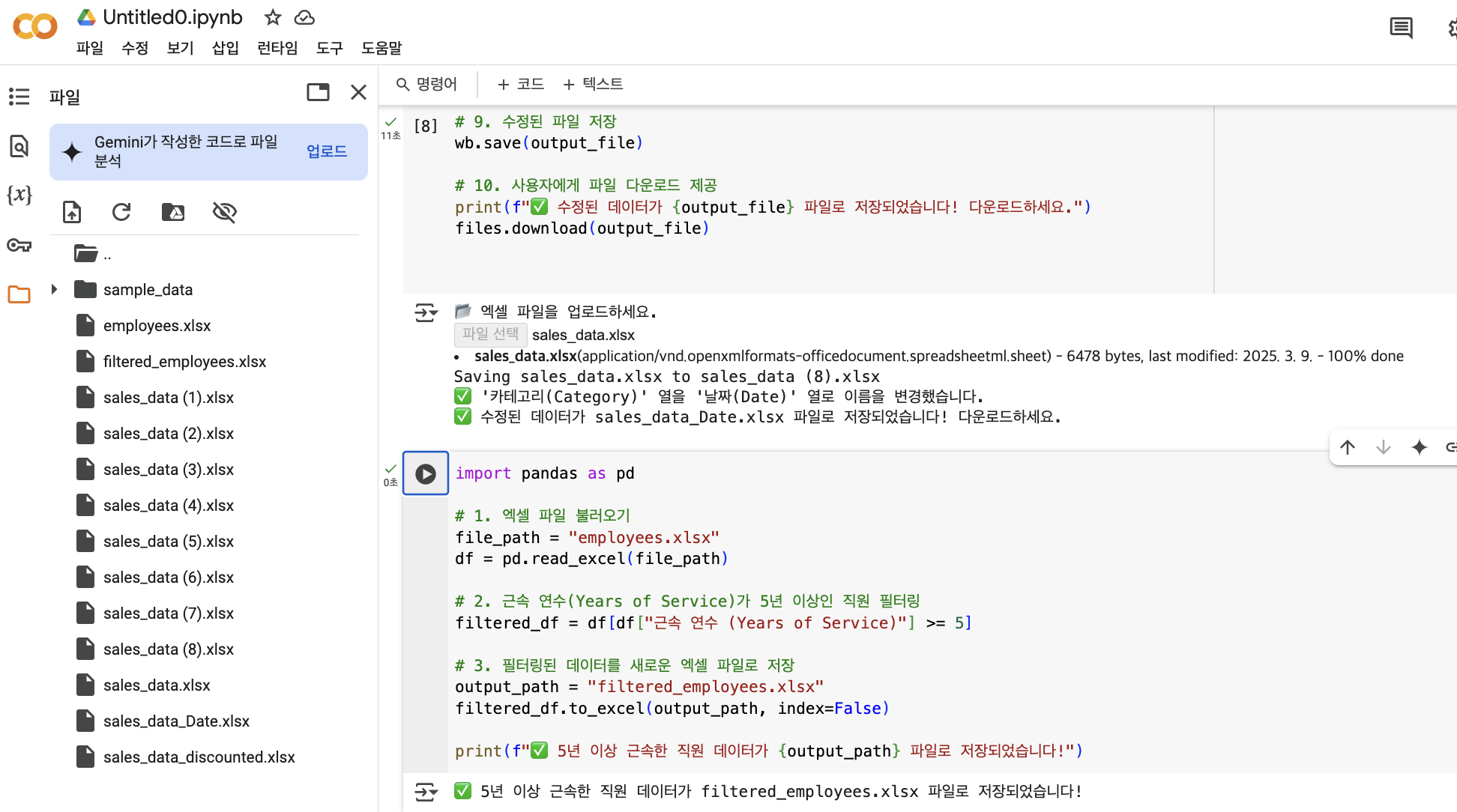 제공된 `employees.xlsx` 파일에는 직원 정보가 포함되어 있습니다.그중 **“근속 연수(Years of Service)”** 열이 있으며, **5년 이상 근속한 직원들만 필터링**하여 새로운 엑셀 파일(`filtered_employees.xlsx`)로 저장하는 자동화 프로그램을 작성하세요. 해결 방법employees.xlsx 파일을 불러오기"근속 연수(Years of Service)" 가 5년 이상인 직원만 필터링필터링된 데이터를 새로운 엑셀 파일(filtered_employees.xlsx)로 저장힌트(파이썬 코드 가이드)pandas를 활용하여 엑셀 데이터를 다룰 수 있다.특정 열을 기준으로 조건을 만족하는 데이터만 필터링할 수 있다.필터링된 데이터를 새로운 엑셀 파일로 저장할 수 있다.imp..